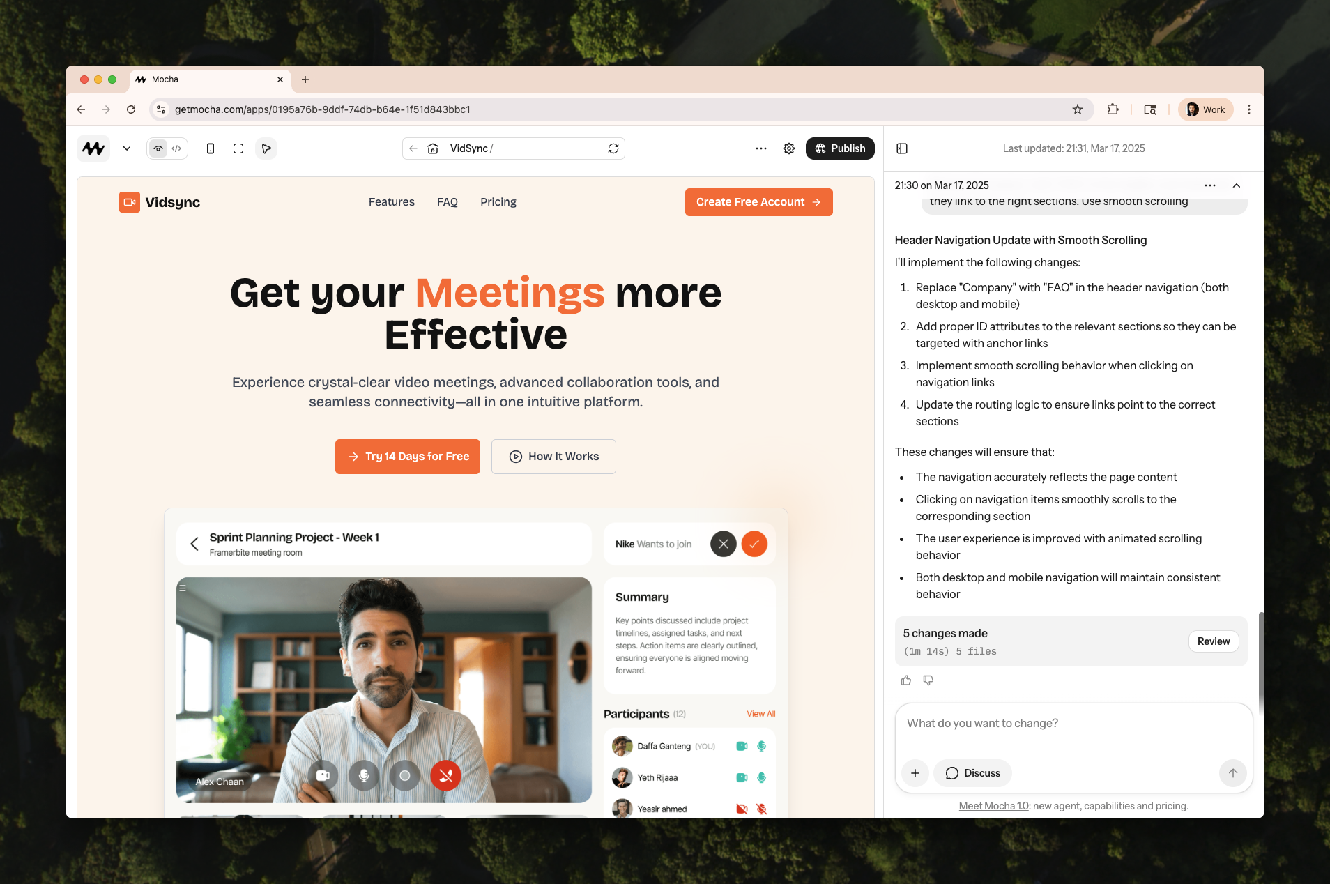 Mocha is an AI-powered app builder that allows you to create beautiful, custom websites using natural language. You simply describe what you want in plain English (or your native language), and Mocha will generate it custom-tailored to your request. You can then keep making changes, improving it, adding features until it’s ready to launch. Finally you can deploy it in one-click and share it with the world. Mocha is different than traditional no-code website builders like Wix, Squarespace, and Webflow. It’s powered by AI and actually writes code, which means the possibilities are endless, rather than using templates and having to learn a complicated interface. Mocha is different than other AI powered website builders like lovable because it is fully integrated. It comes with built-in auth, database, backend, hosting. Because we vertically integrated it, it works better and is more reliable, you also don’t need to connect and pay for multiple other services for auth, database, backend, hosting, etc. Our design philosophy is that Mocha should be the single tool for you to build, launch, deploy and manage your app.