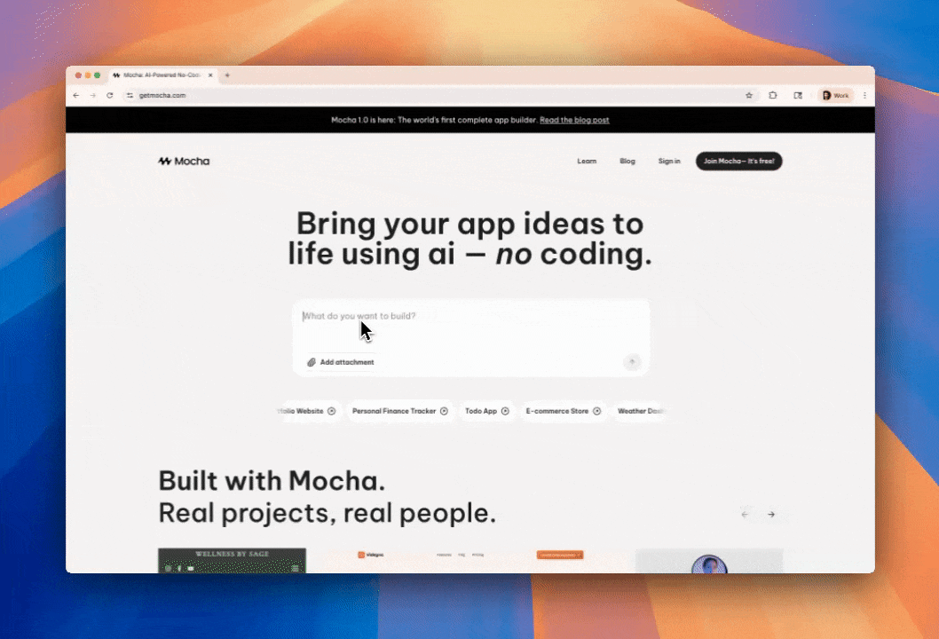 Once registered, you can create your first project. Simply enter a prompt describing what you want to build, and Mocha’s AI will handle the rest.