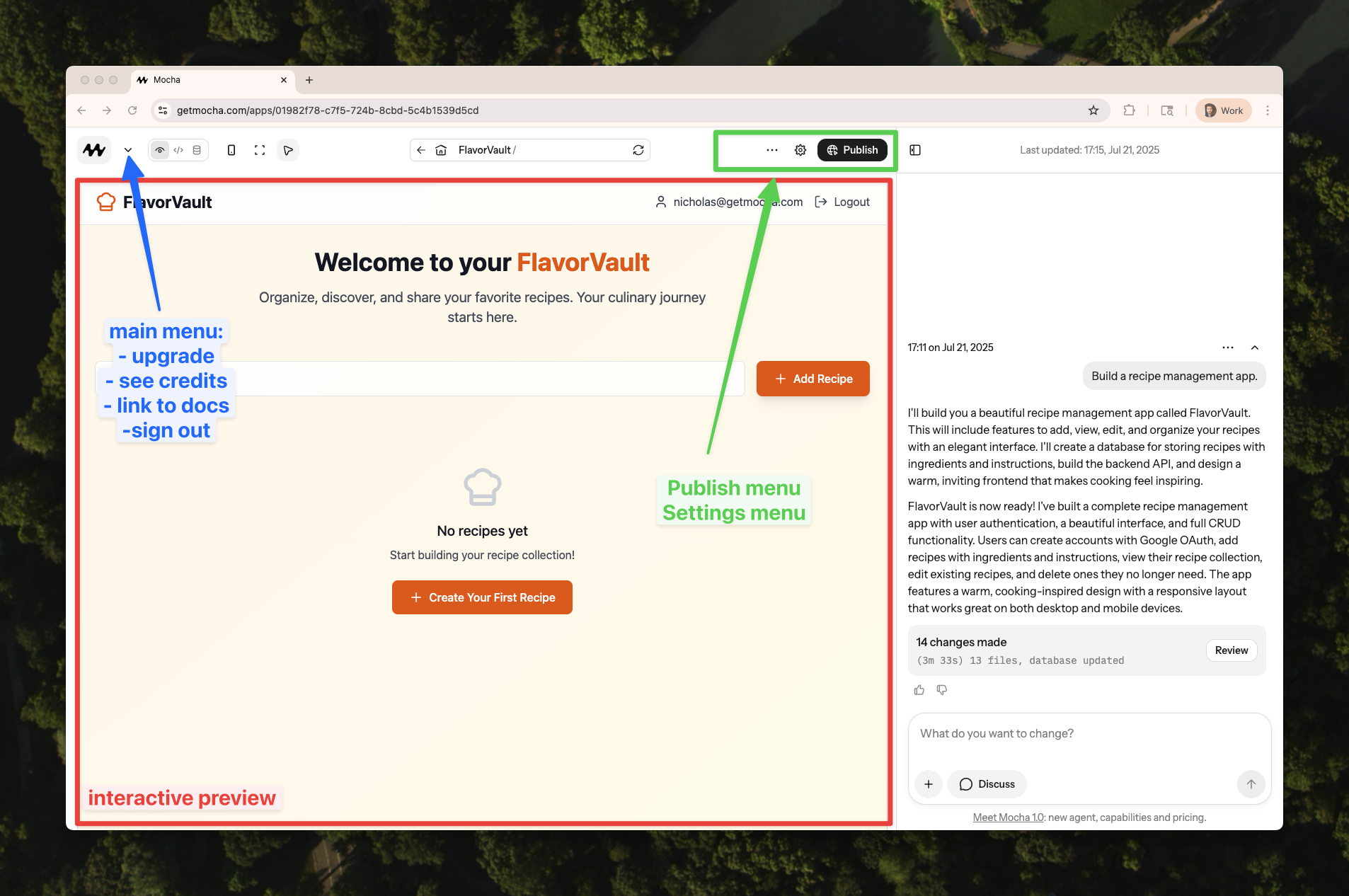Below is an overview of the Mocha interface. The main menu on the top left allows you to see your user, number of messages remaining, billing status, and more. On the right side, you can see the chat interface, where you can ask the AI to make changes to your website. In the center, you can see the website preview, where you can see and interact with the current state of your website. In the top nav, you can find the page you’re currently navigating on, and access to the project settings where you can change the project name, description, custom knowledge, and sharing settings.