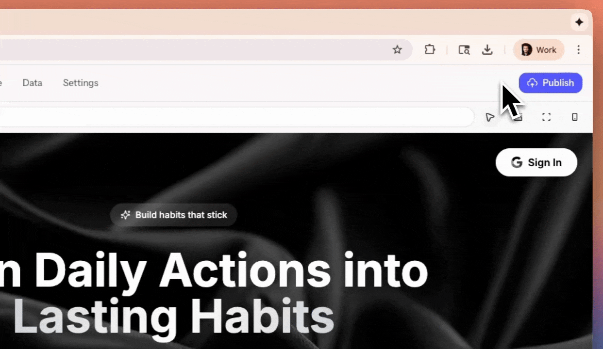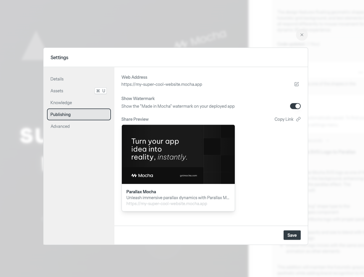 Publish your website to the web with a single click. Your site will be available at a unique mocha.app subdomain.